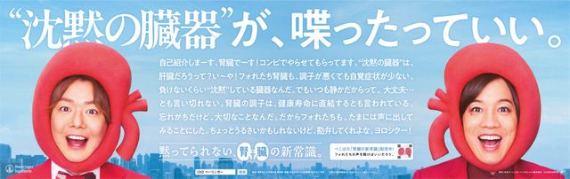 この施策は、交通広告を活用したプロモーションで、多くの通勤客に病気への意識付けを行っている。特徴的なのは、「ぺこぱ」の起用によって重くなりがちな疾患啓発をポップに転換している点にある。腎臓を擬人化し、否定しないツッコミという芸風を活かして“腎臓の声”を代弁させることで、受け手にストレスなく情報を届ける設計となっている。深刻なテーマでありながらも、笑いを交えることで接触ハードルを下げ、記憶に残るコミュニケーションへと昇華している点は、著名人のキャラクターを機能的に活用した例といえる。