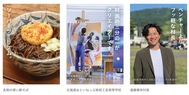 北海道中川郡音威子府村は、その魅力を日本国内で幅広く知ってもらうため、面白法人カヤックと共同でユニークな広告キャンペーンを展開した。音威子府村の開村123周年を記念して、村の写真に一言コピーを添えた123枚のポスターが新宿駅西口に掲出された。地域おこし協力隊の募集に向けたPRである。
