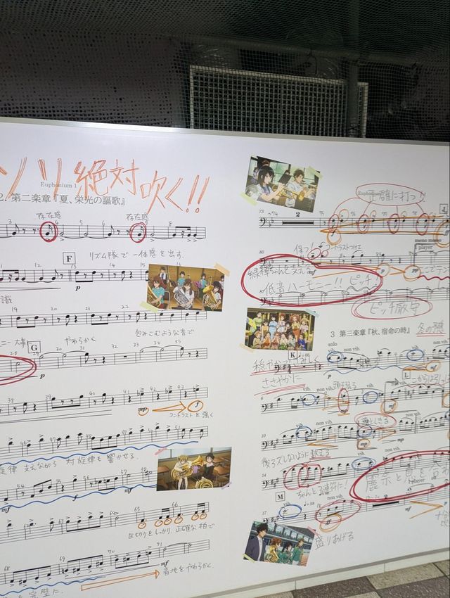 掲出された広告は、楽曲「一年の詩 〜吹奏楽のための」の楽譜そのものをビジュアルとして使用した点が特徴だ。東京では主人公・久美子のユーフォニアムパート、大阪では麗奈のトランペットパートがそれぞれ掲出され、ファンにとっては実際に演奏可能な"リアルな楽譜"として機能する構成となっている。さらに、この施策の特徴は時間経過による変化にある。掲出初期は譜面のみのシンプルな状態で提示し、その後、奏者が書き込んだメモや書き込みが加わることで、楽譜が"使われた痕跡"と"熱量"を帯びたビジュアルへと変化した。静的な広告でありながら、時間を通じて物語が重なっていく設計となっている。