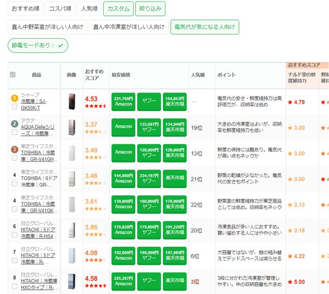 太田:例えば、冷蔵庫のランキングを知りたいときって電気代の安さで見るのか、野菜室をどの位置で欲しいのかなど色々あると思いますが、電気代の安さで見たいときはそれ用の表示をすることができます。