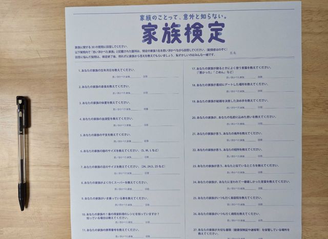 また、「家族検定」の企画では、一見簡単そうで意外と答えられない質問が並ぶ。生年月日や血液型といった基本情報から始まり、服のサイズ、靴のサイズといった日常的な細部にまで及ぶ。さらには「よく行くスーパー」「得意料理のレシピ」といった生活習慣に関する質問も用意されている。
