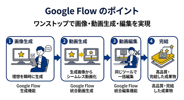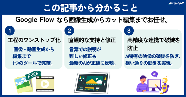 その理想を現実のものにしたのが、今回ご紹介する「Google Flow(フロー)」です。ここからは、なぜこのツールがビジネスの最強の右腕になり得るのか、その理由をご紹介していきます。