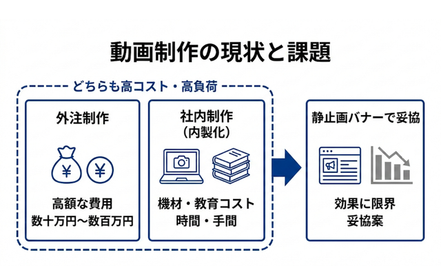 代理店に外注すれば、1本のPR動画で数十万円。かといって自社で内製しようと最新の編集ツールを導入しても、操作を覚えるだけで数週間が過ぎてしまう…そんなリソースの壁にぶつかり、結局は静止画のバナー広告で妥協しているという声を現場では本当によく耳にします。