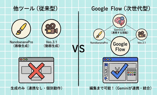 Googleの他ツールとも一線を画します。画像に強いMixboardは動画非対応ですし、Sora2などは生成のみで秒数を削るといった編集機能がありません。Flowが万能なのは、画像生成の「Nanobanana 2」、動画の「Veo 3.1」、そして「脳」の役割を果たす「Gemini 3」が三位一体で連携しているからです。