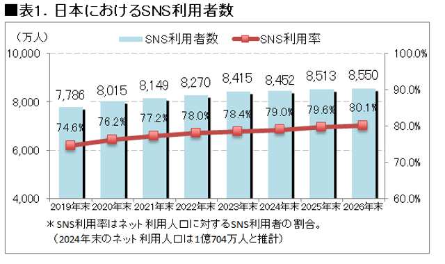 日本のSNS利用者数は年々増加、2026年末には8,550万人へ