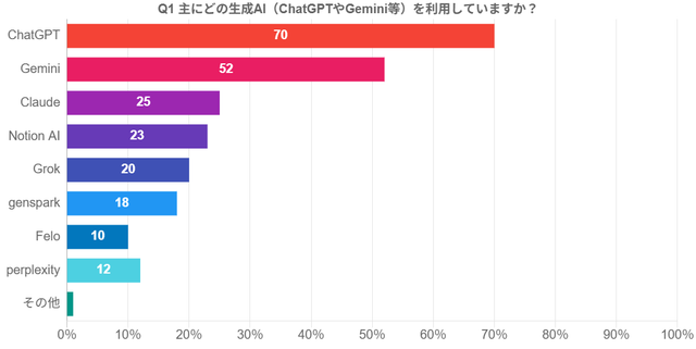 生成AI利用率はChatGPTが70%でトップ、Geminiが52%で追随