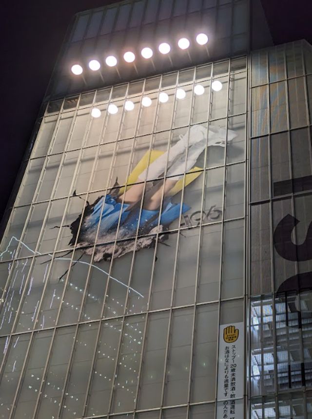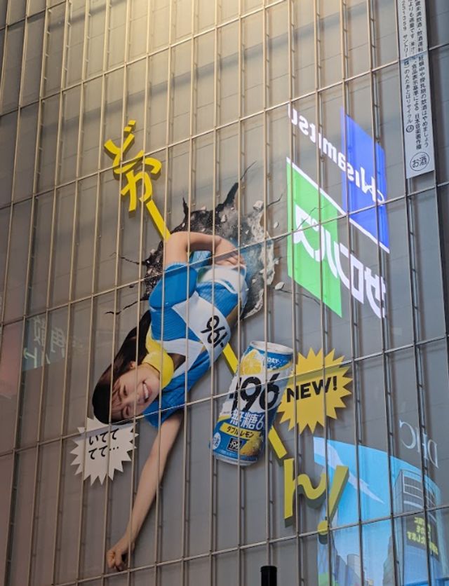 渋谷駅で掲出されたサントリーチューハイ「−196(イチキューロク)」の広告。渋谷凪咲さんが演じる-196ウーマンがQ FRONTビル両サイドの壁面に衝突しているデザインで、ファンを中心に話題となっています。