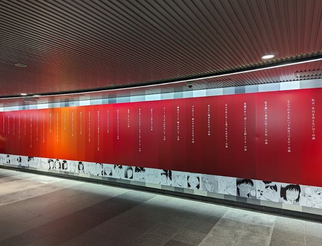同じ赤色でありながら遠目でも違いが分かる程度になっており、グラデーションのように見える視覚的な仕掛けが、通行人の興味関心に繋げていた印象でした。
