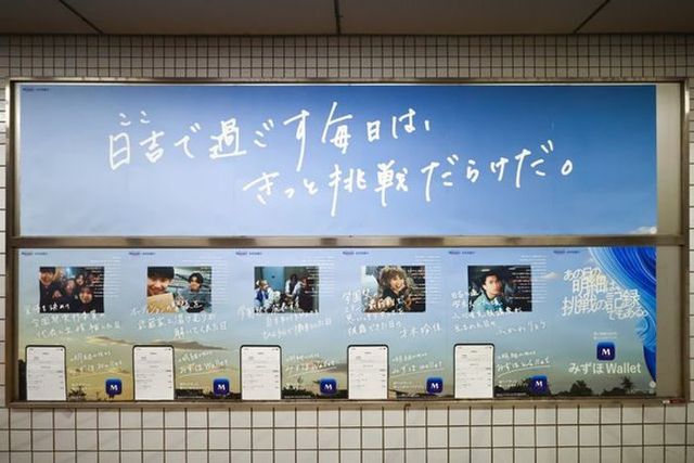 みずほ銀行は「みずほWallet」の利用明細を思い出に変える「青い挑戦の日の記録」を、早稲田大学など4大学の最寄り駅に展開しました。実際の学生16名と6名のタレントのエピソードを、学生街の店舗名を織り交ぜた駅構内ポスターで表現し、在校生や卒業生の共感を呼び起こしています。