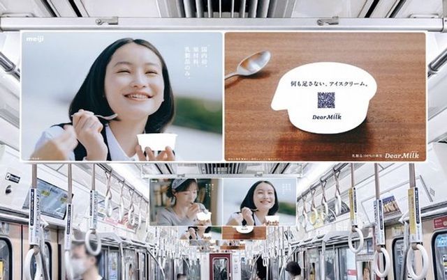 明治の「Dear Milk」は、乳製品100%という商品特性を表現するため、山手線や田園都市線などの交通広告でパッケージを白抜きにした「真っ白抜き広告」を展開しました。アイス好きのヘビー層とライト層双方への認知拡大と販売促進を目的とし、SNSでの反応も得られています。