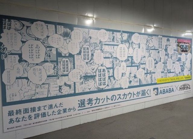 株式会社ABABAが人気漫画『トリリオンゲーム』とコラボし、就活解禁の3月に渋谷駅や渋谷109でキャンペーンを展開しました。主人公ガクの口癖「あばば」と会社名が一致した偶然をきっかけに、フォトスポットやボード広告で「あばば」文字を大量掲出し、サービス認知と企業ブランド確立を図っています。