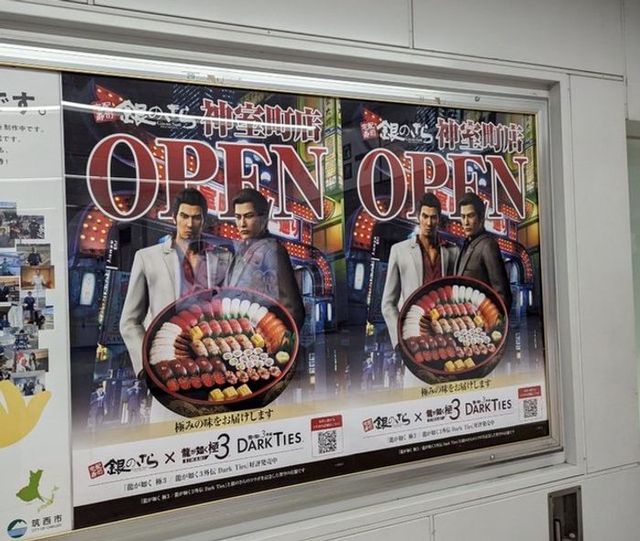 銀のさらがセガの人気ゲーム『龍が如く』とコラボレーションし、新宿駅でゲーム内の架空店舗「銀のさら神室町店」の開店告知ポスターを掲出しました。リアルな街並みを舞台にしたゲームの世界観と現実空間を接続し、通行者に違和感と興味を喚起する逆転の発想が特徴です。