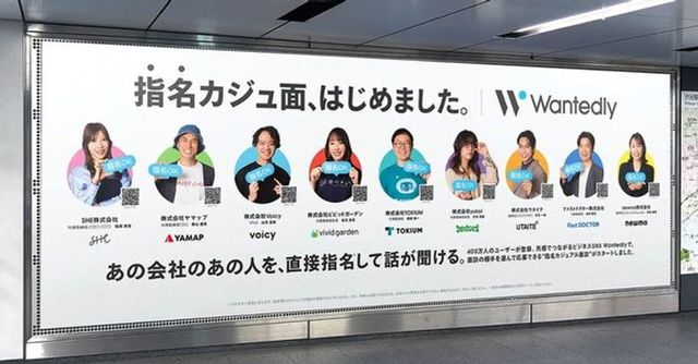 Wantedlyが東急東横線渋谷駅で、新機能「指名カジュアル面談」の提供開始を記念した交通広告を掲出しました。スタートアップ9社の経営メンバーを起用し、広告内のQRコード読み込みでその場から面談申し込みができる仕組みで、駅という日常動線からオンラインの採用活動へシームレスに誘導する取り組みとなっています。
