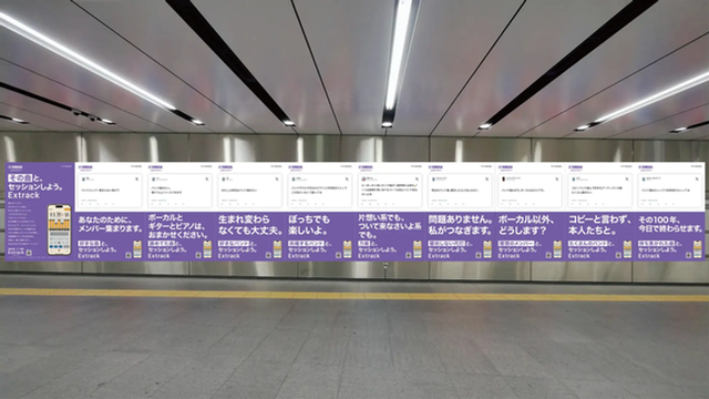 ヤマハは新感覚音楽アプリ「Extrack」のプロモーションとして、渋谷駅にX投稿を引用したOOH広告を掲出しました。楽器演奏者の悩みやバンドへの憧れといったユーザーの本音の声を大型ポスターに集約することで、信頼性と親しみやすさを両立させた施策となっています。