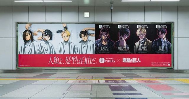 ホットペッパービューティーは、人気アニメ『進撃の巨人』とコラボし、キャラクターが新しいヘアスタイルに挑戦する「人類よ、髪型は自由だ。」キャンペーンを展開した。池袋駅や新宿駅などの首都圏主要駅の交通広告でビフォーアフターのビジュアルを掲出し、ボイスドラマなどのコンテンツと連動させることで、髪型変更への心理的ハードルを乗り越え、自分らしいスタイルへの挑戦を後押しした。