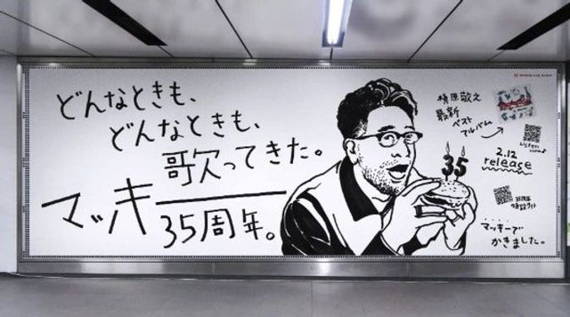 ゼブラの油性マーカー「マッキー」とシンガーソングライター槇原敬之さんの同じ愛称を活かし、ベストアルバム発売記念として「マッキー」で完全手書きした駅貼りポスターが渋谷・大阪に掲出された。イラストからQRコードまで細部にこだわって描かれた温かみのあるビジュアルで、35周年の節目を印象的に表現している。