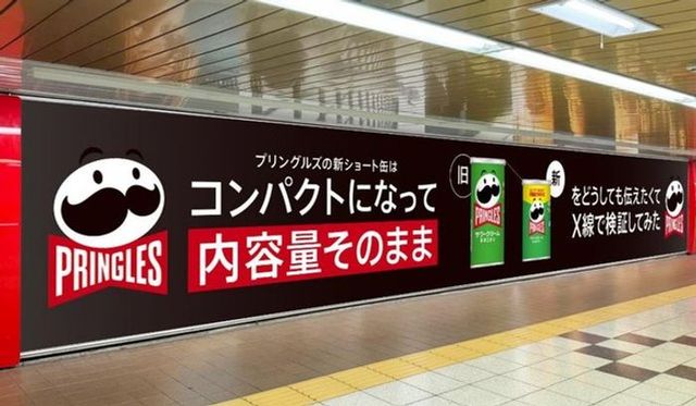 プリングルズがパッケージをコンパクト化した新商品の内容量が変わらないことをアピールするため、X線を使った「ポテチのレントゲン広告」を新宿駅で展開しました。消費者調査でパッケージサイズが購入意向に大きく影響することが判明したため、前代未聞の透け透けクリエイティブで話題化を狙いながら、内容量据え置きであることを効果的に伝えています。