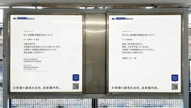 長倉製作所がJR沼津駅で展開した駅広告は、社長と広報チームの社内メールをそのまま貼り付けるという斬新な手法で、企業認知とリクルート効果を狙いとしています。生々しいやり取りを露出することで、真面目さだけでない親しみやすさと仕事への誠実さを同時に表現し、見る人との心理的距離を縮める工夫がなされています。