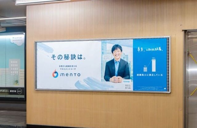株式会社mentoは、管理職向けコーチングサービス「mento」の導入事例を紹介する交通広告を新橋駅や品川駅など全国12の主要駅で展開しました。クラレやパナソニックなどの実際の導入企業の担当者を起用し、コーチング導入後の具体的な成果と活き活きとした職場環境を視覚的に表現することで、説得力を高める工夫を行っています。