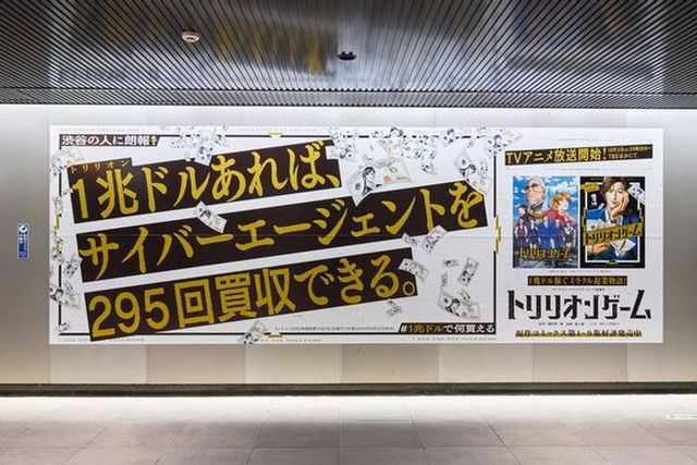 小学館が10月放送開始となるアニメ「トリリオンゲーム」の宣伝で、東京・神奈川19駅に「#1兆ドルで何買える」をテーマにした駅貼りポスターを展開している。各駅の特徴に合わせた地域性豊かなコピーで1兆ドルの規模をわかりやすく伝え、SNSでの発信を促す仕掛けとなっている。