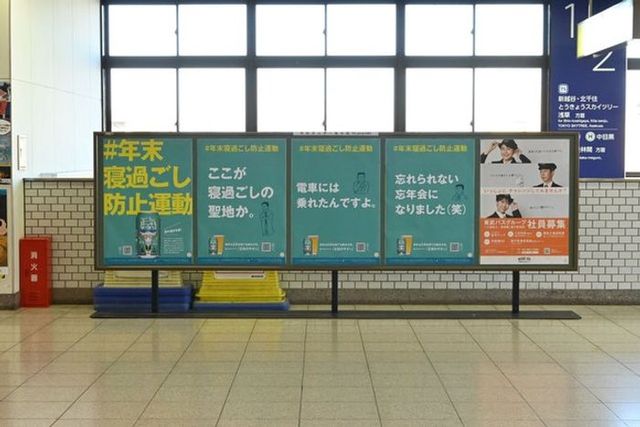 ヤッホーブルーイングは忘年会シーズンに合わせ、終着駅7駅で「#年末寝過ごし防止運動」を展開。アルコール度数0.7%の微アル飲料「正気のサタン」をユーモアたっぷりのポスター21種類で訴求した。SNSキャンペーンでは2日間で200件の体験談が寄せられるなど、共感を呼ぶ企画で話題化に成功している。