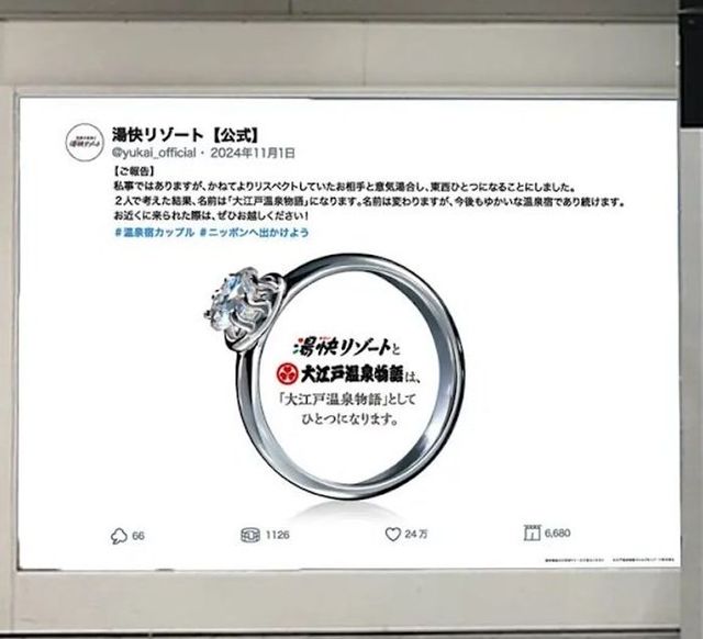 大江戸温泉物語と湯快リゾートのブランド統合を機に、両社は東京・大阪の駅に交通広告を展開しました。ブランド統合を「結婚報告」に見立てたユーモラスなSNS風デザインで、全国66施設を擁する日本最大級のカジュアル温泉宿ブランドの誕生をPRしています。