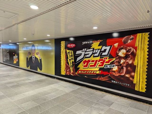 ブラックサンダーの発売30周年を記念し、有楽製菓は渋谷駅で「社長に雷を落とす」交通広告を展開しました。フラッシュ撮影で社長が雷に打たれる演出が浮かび上がる仕掛けで、ブランドのイナズマシンボルと撮影時のフラッシュを組み合わせた参加型広告となっています。1年かけて30の企画を展開する「30の楽雷」プロジェクトの第一弾として、ユーザーを巻き込み、遊び心のあるブラックサンダーらしさを表現した施策です。