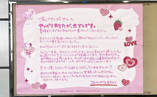スシローとブラックサンダーがコラボレーションし、カヤックが企画・制作した駅貼り広告キャンペーンです。両社の本社・工場所在地であるJR吹田駅と豊橋駅にそれぞれ手書きのラブレター広告を掲出し、「甘酸っぱい再会」をテーマに世界で一つだけの手書きメッセージで話題化を狙いました。手書きならではの温かみと修正跡などの細部にこだわり、昨年の施策との連続性を保ちながらブランドの個性を表現した施策となっています。