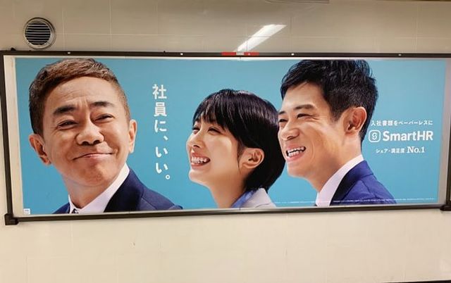 クラウド人事労務ソフト「SmartHR」が、都内主要駅構内や電車内に交通広告を掲出しました。新CM放送開始に合わせ、木梨憲武さん、伊藤淳史さん、松本穂香さんの3人が登場する駅貼りポスターと山手線車内の中吊り広告で、ペーパーレス化による働きやすさと職場環境の改善を表現しています。