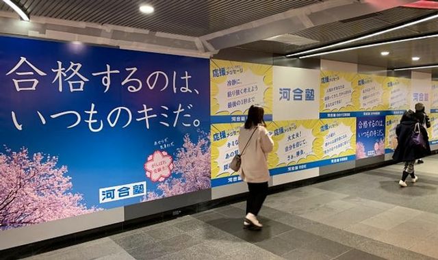 河合塾は受験シーズンに合わせて、渋谷駅と新宿駅の駅構内に大型広告を掲出しました。「合格するのは、いつものキミだ。」というコピーと各教室からの応援メッセージで、受験生の気持ちを盛り上げる広告キャンペーンを展開しています。