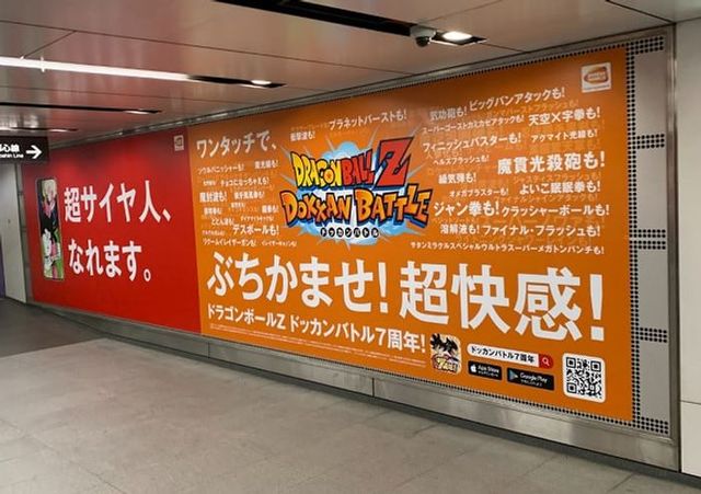 バンダイナムコエンターテインメントは、スマートフォンゲーム「ドラゴンボールZ ドッカンバトル」のサービス開始7周年を記念し、東急田園都市線渋谷駅構内に大型広告を掲出しました。赤とオレンジの鮮やかな背景にドラゴンボールZのキーワードを散りばめた広告で、乗り換え客を中心に幅広い層へのPRを実現しています。
