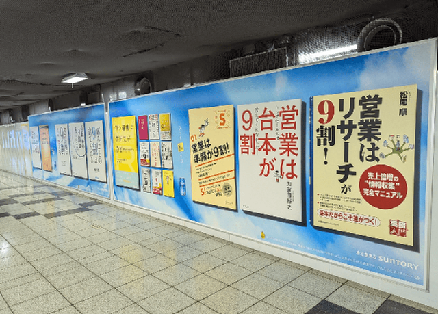 サントリーの「ザ・プレミアム・モルツ〈ジャパニーズエール〉香るエール」は、世の中に溢れる"9割本"に着目した「#9割がいっぱい」キャンペーンを展開しました。新宿駅メトロプロムナードに巨大な本で埋め尽くされた交通広告を掲出し、日本のビール市場で少数派のエールタイプという個性を際立たせる施策です。