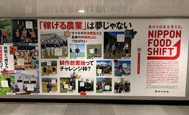 農林水産省は、日本の食料自給率や食育を推進する国民運動「ニッポンフードシフト」の大型広告を、東急田園都市線渋谷駅の地下1階に掲出しました。食に携わる若者たちの写真とメッセージで、日本の食のあり方について考えることを呼び掛けています。