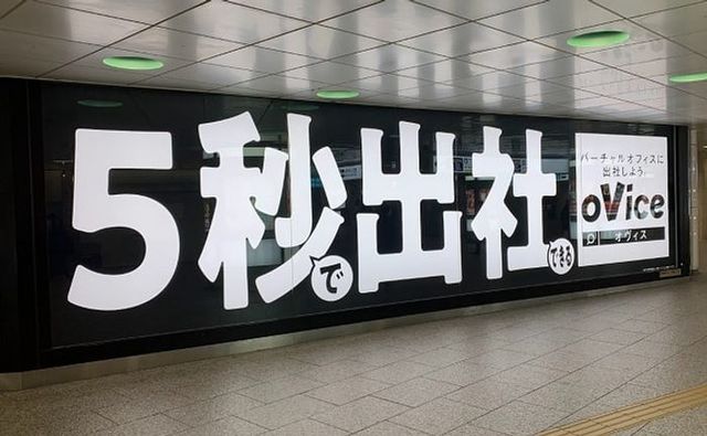 oVice株式会社は2022年1月より、バーチャルオフィスサービス「oVice」の広告を都内の駅や電車、タクシー内など多数の交通広告で展開しました。「5秒出社」というインパクトのあるコピーで、通勤不要の働き方を新聞広告と組み合わせてPRしています。