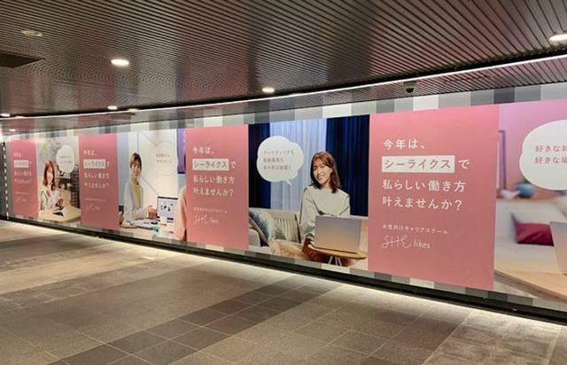 SHE株式会社は、女性向けキャリアスクール「SHElikes」の大型広告を東急田園都市線渋谷駅に掲出しています。副業やフリーランスなど多様な働き方を実現した女性たちのいきいきとした姿を表現し、PC一つで稼げるスキル習得への支援をアピールしています。