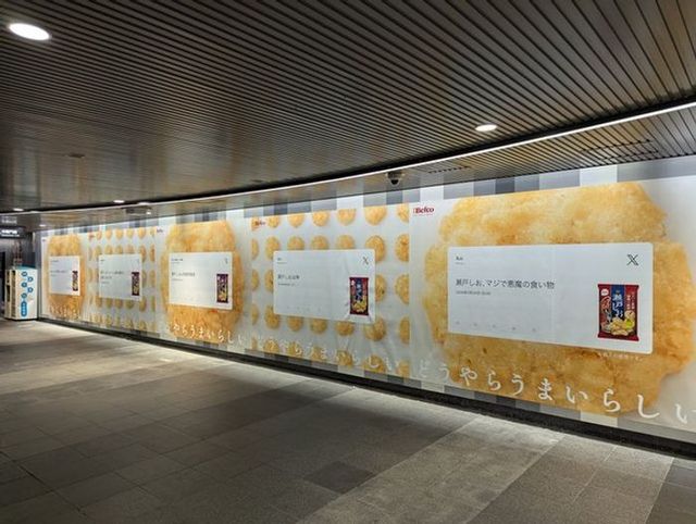 栗山米菓の「瀬戸しお」は、X上のユーザー投稿をそのまま広告クリエイティブに活用したOOH・WebCMキャンペーンを2024年9月から展開しました。渋谷BIG20やJR新宿駅などの大型媒体に、「どうやらうまいらしい」というキャッチコピーと共に実際のユーザーの生の声を掲載することで、隠れたファン層の可視化とブランド認知の拡大を図りました。