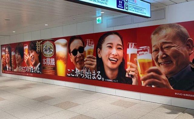キリンビール株式会社は、売上を伸ばしている新ジャンル飲料「本麒麟」のリニューアルを機に、JR新宿駅の東西自由通路壁面に大型広告を掲出しました。江口洋介、タモリ、杏、高畑充希に加え、國村隼と滝藤賢一が新たに参加した豪華キャストが、本麒麟の美味しさをPRしています。