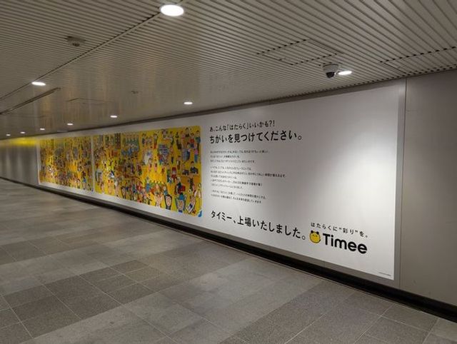 タイミーは2024年7月の東京証券取引所上場を記念して、渋谷駅で「ちがい探し広告」を展開しました。有名イラストレーターを起用した間違い探しのビジュアルで、タイミーのサービス拡大前後の「働き方のちがい」を表現し、企業の新しい価値観と機能をユーザーに楽しく伝える施策となっています。