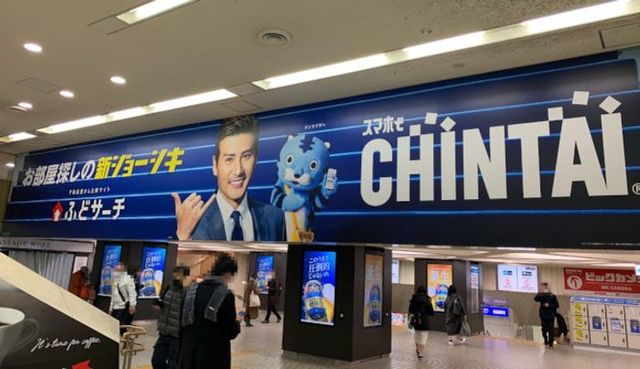 CHINTAIがお部屋探しアプリ「スマホでCHINTAI」と不動産会社比較サイト「ふどサーチ」の認知拡大のため、新イメージキャラクターの新庄剛志さんを起用した交通広告を新宿駅と渋谷駅に掲出しました。新宿駅では新庄さんとマスコットキャラクターの大型広告を、渋谷駅では柱巻広告を展開し、インパクトのあるPRを実施しています。