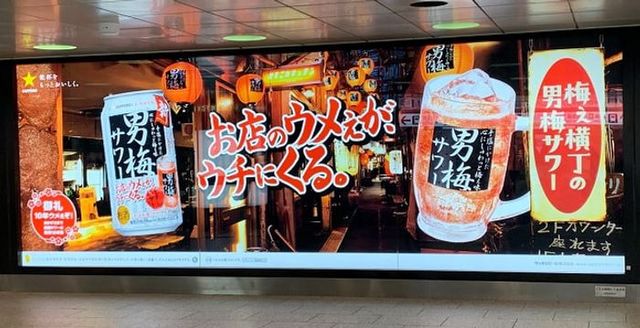 サッポロビールは、ノーベル製菓の「男梅キャンデー」とのコラボ商品「男梅サワー」をJR新宿駅西口の地下広場に交通広告で展開しています。梅果汁の酸味と塩味が特徴の居酒屋系梅干しサワーについて、赤提灯がインパクトのある駅貼りポスターでPRを行っています。
