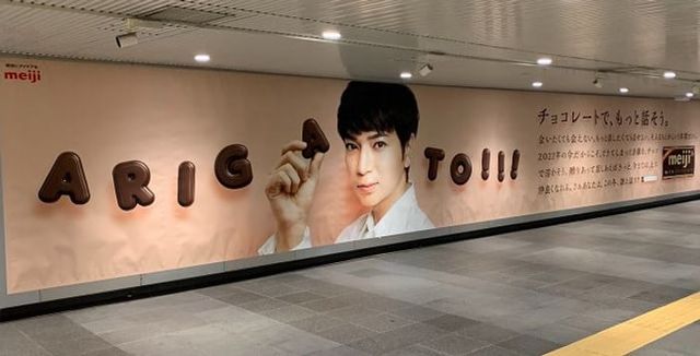 明治は2022年2月、96周年を迎える「明治ミルクチョコレート」のバレンタインキャンペーンとして、イメージキャラクターの嵐・松本潤を起用した全長21.84mの大型広告を渋谷駅に掲出しました。「ARIGATO!!!」「ALL OF YOU!」というチョコ文字で距離を溶かそうというメッセージを表現した広告です。