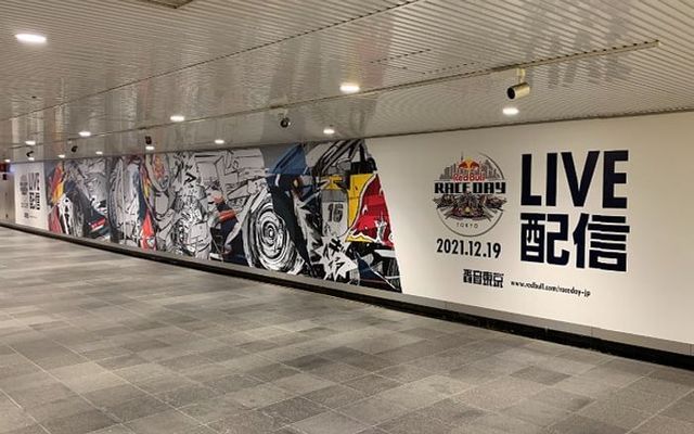 Red Bullは、2021年12月19日に開催される都市型複合モータースポーツイベント「Red Bull Race Day」のライブ配信をPRするため、東急田園都市線渋谷駅地下1階の大型ボード『東急道玄坂ハッピーボード』に広告を掲出しました。レースのスピード感と迫力を表現したイラストと「LIVE配信」のコピーで、駅の多くの利用者にイベントの魅力を訴求しています。