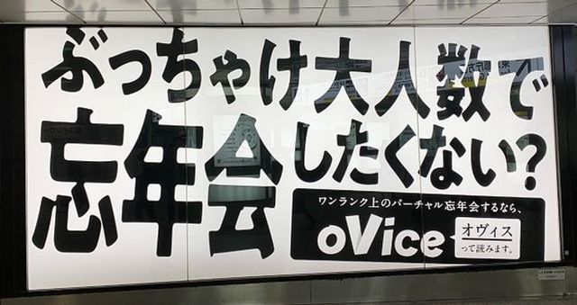 oVice株式会社は、バーチャル空間での忘年会開催と食事配送をセットにした「oVice忘年会」サービスをPRするため、都内の駅に大型広告を掲出しました。「ぶっちゃけ大人数で忘年会したくない?」というシンプルなキャッチコピーで、リモートワーク時代のビジネスマンに向けた新しいコミュニケーションツールの利用を促進しています。