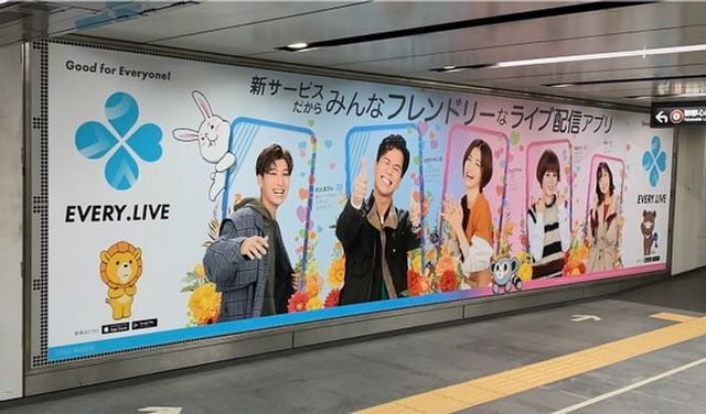 STAGE株式会社は、新しいライブ配信アプリ「EVER.LIVE」の認知拡大を目指し、東急渋谷駅構内に巨大駅貼りポスター広告を掲出しました。スマートフォン一つで誰でも気軽にライブ配信できるという特徴を、華やかなポスターでアピールし、乗り換え利用者への高い訴求効果を実現しています。