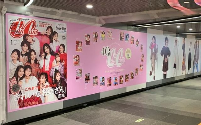 小学館は創刊40周年を迎えたファッション雑誌「CanCam」の記念号を、東京メトロ渋谷駅の地下通路に大型広告で展開しました。現役の専属モデルや過去の表紙を掲載した豪華な広告で、20代女性層への高い訴求効果を実現しています。