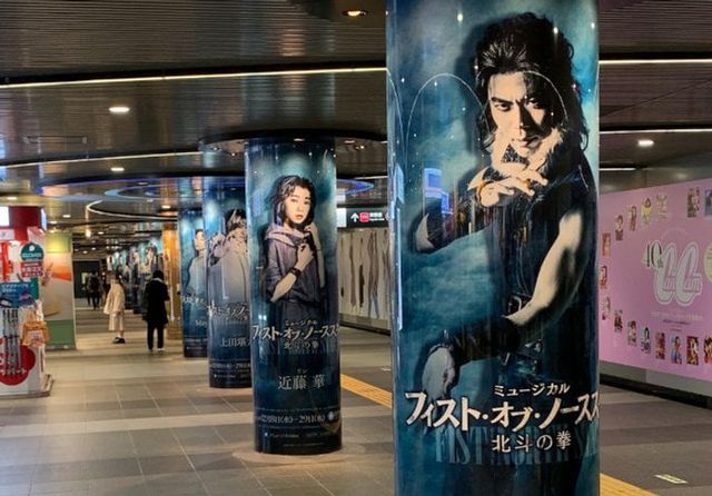 ミュージカル「北斗の拳」が東京メトロ渋谷駅の柱巻広告で宣伝を展開しています。登場人物のビジュアルを掲載した広告により、ミュージカルの世界観を駅利用者に効果的にアピールしています。