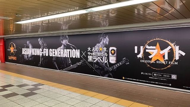 サッポロが販売する「サッポロ生ビール黒ラベル」は、ロックバンド・ASIAN KUNG-FU GENERATIONとのコラボ企画第4弾として、代表曲「リライト」をショートフィルム化し、首都圏の駅にデジタルサイネージと駅貼りポスターで広告を掲出しました。東京メトロ新宿駅の大型スペースを活用した視認性の高い広告展開により、楽曲と商品の親和性を効果的に訴求しています。