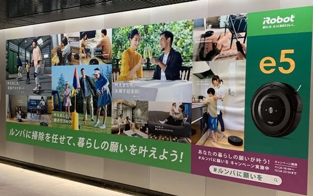 iRobotは東急田園都市線渋谷駅の地下2階に、ロボット掃除機「ルンバ」の大型広告を掲出しました。杉山愛さんら著名人が出演し、Twitterの「#ルンバに願いを」キャンペーンをPRしています。