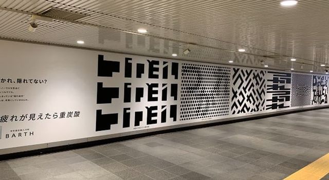 株式会社TWOの入浴剤「BARTH」が、東急田園都市線渋谷駅に大型駅貼りポスター広告を掲出しました。「#疲れが見えたら重炭酸」というコピーとともに、幾何学模様の中に隠された「つかれ」の文字が見える工夫されたデザインで、ドイツの中性重炭酸泉を再現した製品の疲労回復効果をアピールしています。
