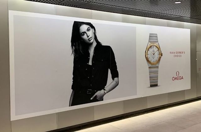 スイスの高級腕時計メーカー「OMEGA」が、ブランドアンバサダーを務めるモデル・カイア・ガーバーを起用し、東急田園都市線渋谷駅構内に大型駅貼りポスター広告を掲出しました。モノクロ写真と輝く腕時計を組み合わせた洗練された広告で、人通りの多い改札周辺から商業施設への導線で高い認知効果を実現しています。